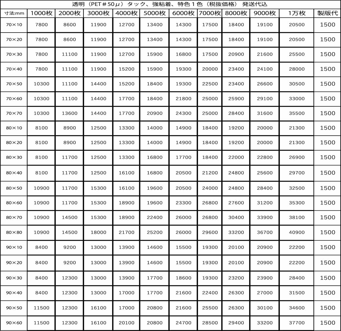 価格表 特色1色 ラミネート無し